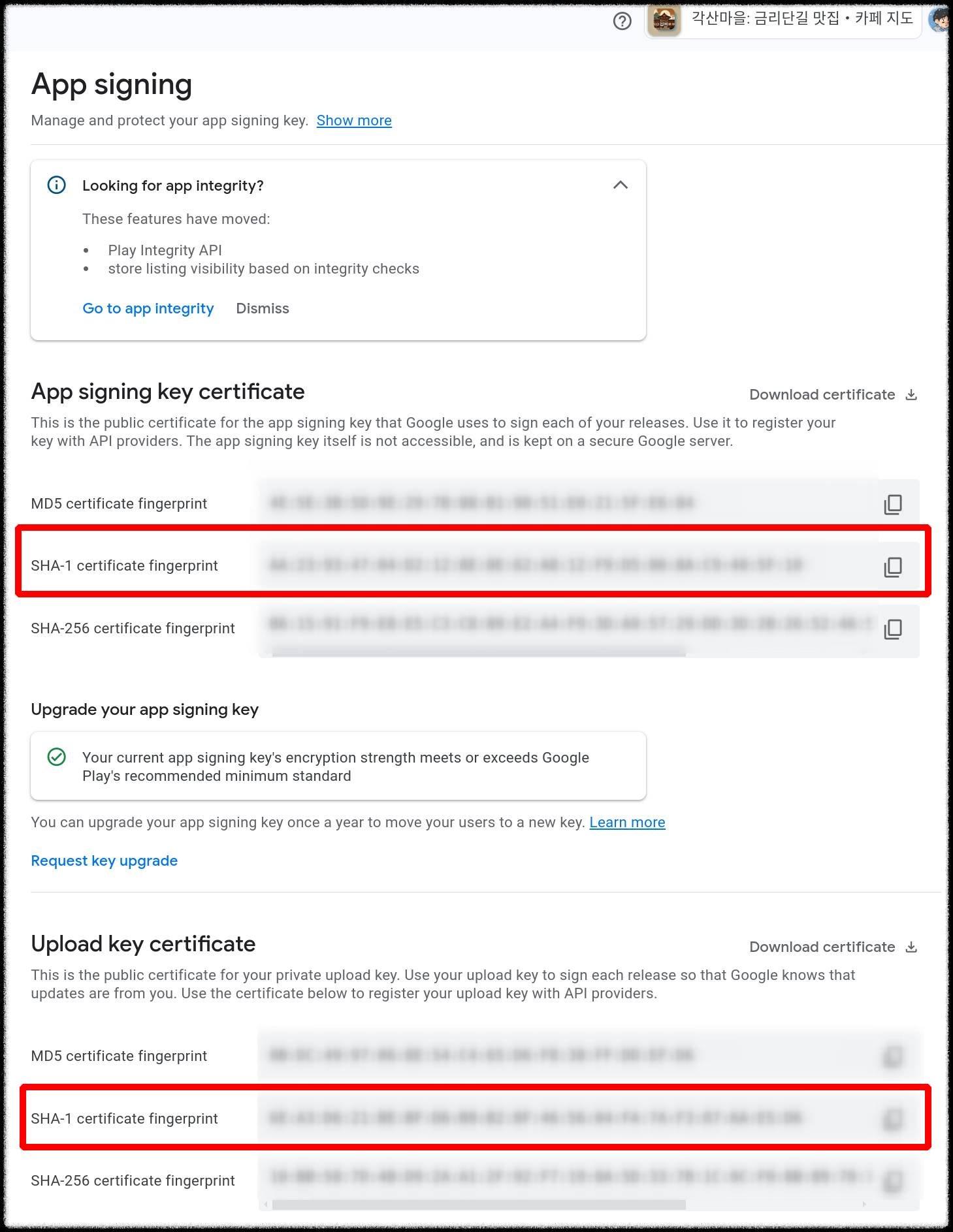 - 'App signing' 섹션에서 SHA-1 인증서 지문 확인