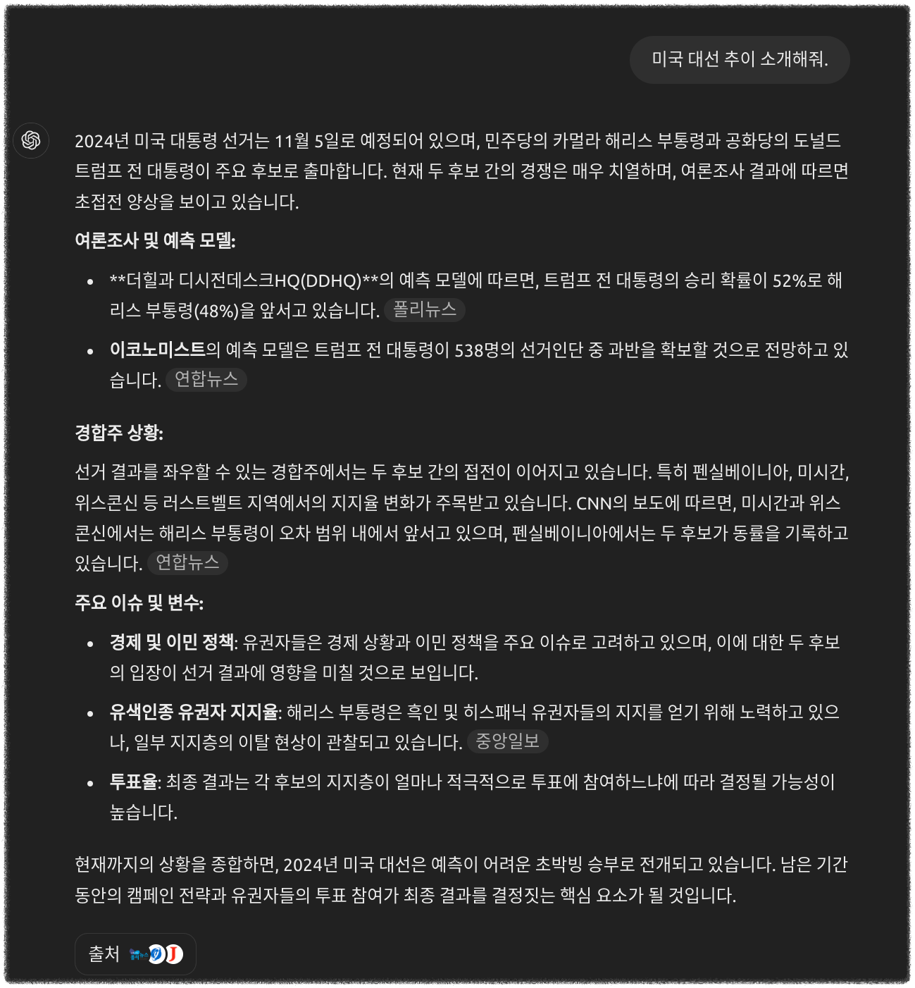 ChatGPT Search는 단순히 검색 결과를 나열하는 것이 아니라, 대화형 질문을 이해하고 맥락을 이어가는 방식으로 사용자와 상호작용합니다. 이전 대화의 맥락을 기억하고, 연속적인 질문에도 일관성 있게 답변을 제공합니다.