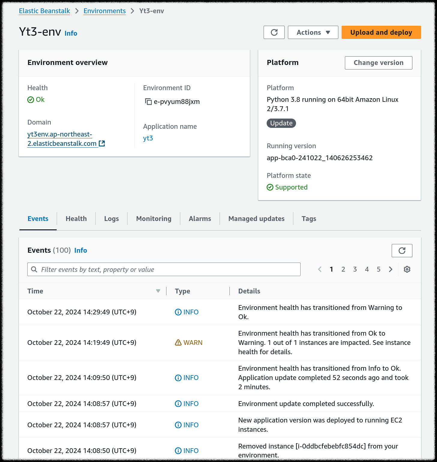 ElasticBeanstalk의 장점은 코드 배포가 상당히 간단하다는 것입니다. 아래 명령어 하나 입력하는 것 만으로 로컬의 내 코드가 ec2 환경에 적용이 되어, django 서비스가 재시작이 됩니다.