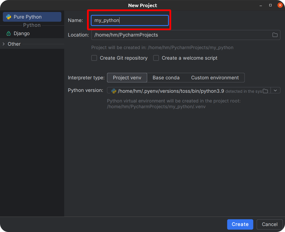 - File -> New Project를 선택합니다. 여기서 새로운 Python 프로젝트를 시작할 수 있습니다. 프로젝트 위치와 Python 인터프리터를 선택하면 기본 설정은 끝납니다.