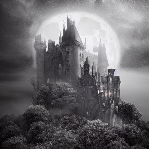 A mysterious gothic castle perched on a cliff under a full moon, its dark spires reaching towards the sky. The castle is surrounded by a dense forest, with twisted trees and thick fog rolling in from the sea below. Lightning occasionally flashes, illuminating the intricate stone carvings and gargoyles that decorate the castle's exterior. The atmosphere is eerie yet captivating, with a sense of ancient power and forgotten secrets. Ultra-high detail, 8K resolution, with a dark, atmospheric gothic style.