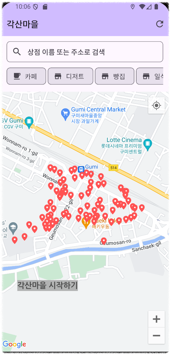 '각산마을' 앱은 지역 상점들을 쉽게 찾고 정보를 확인할 수 있는 지도 기반 애플리케이션입니다. Flutter를 사용하여 5일이라는 짧은 기간 동안 개발되었으며, 구글 맵 통합부터 사용자 경험 최적화까지 다양한 도전과 성과가 있었습니다.